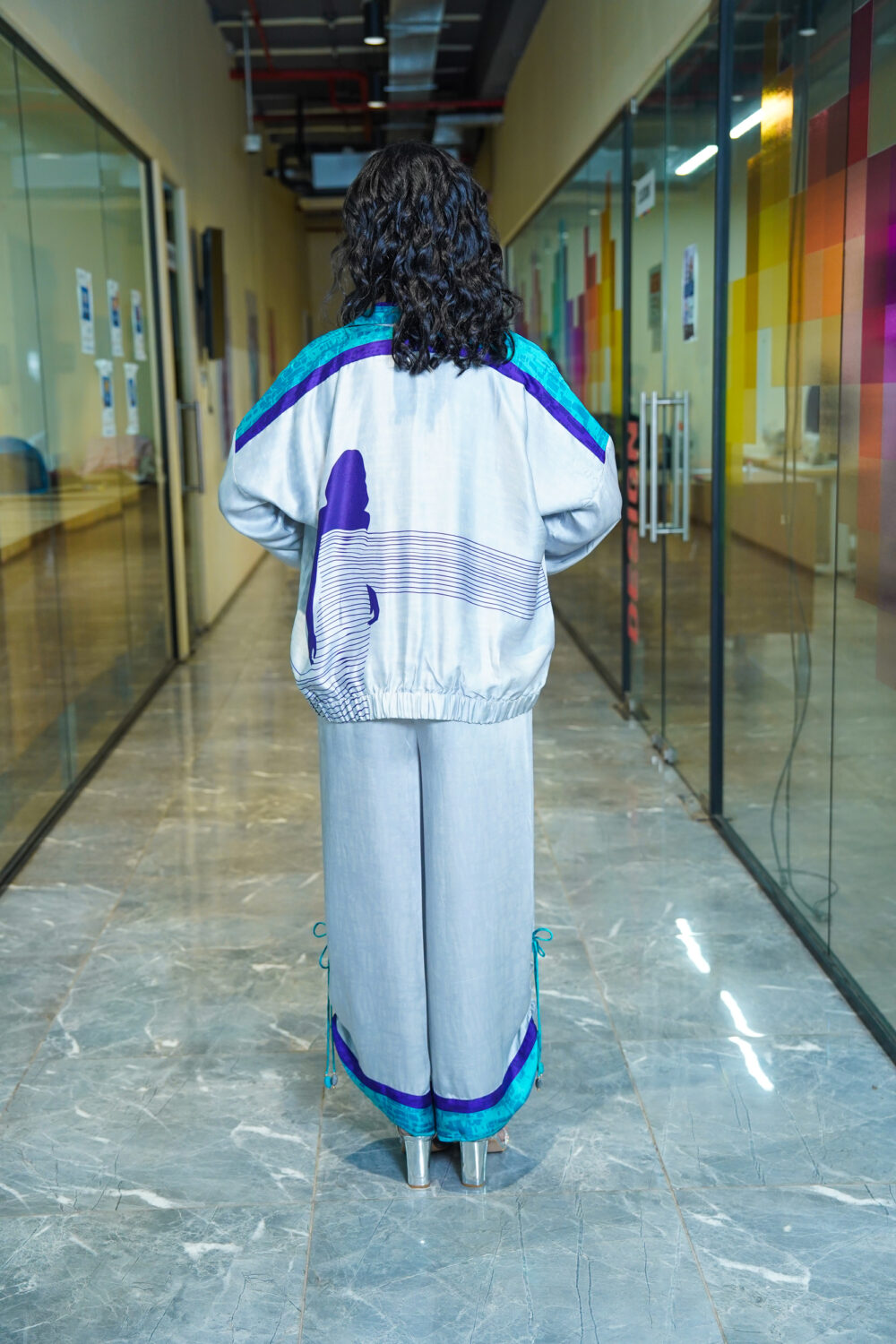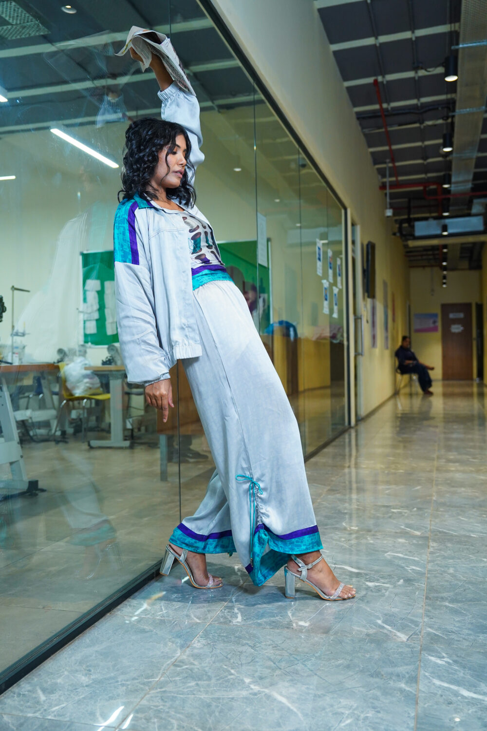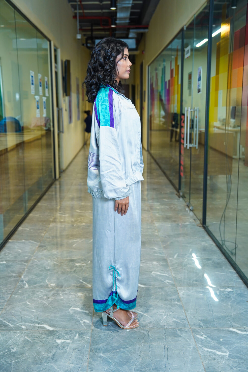 Travel in style with our Bomber Jacket and Drawstring pants set. Make this a brunch outfit or an airport look. The Jacket has a elasticated hem and zipper closer for comfort. The inner is trech with a elasticated back to give you a perfect fit while the pants are easy, wide legged with drawstrings to add oomph. Made from soft luxurious cotton satin to keep you comfortable yet super stylish.