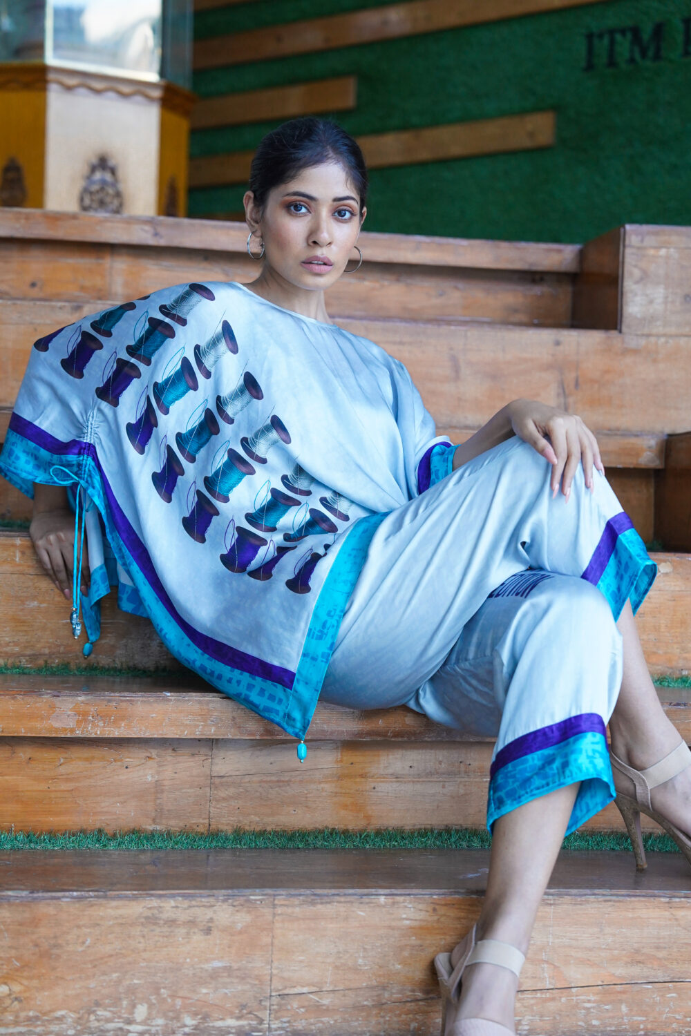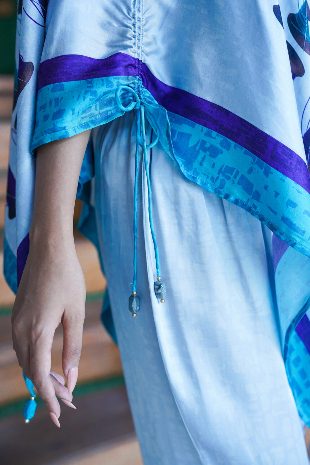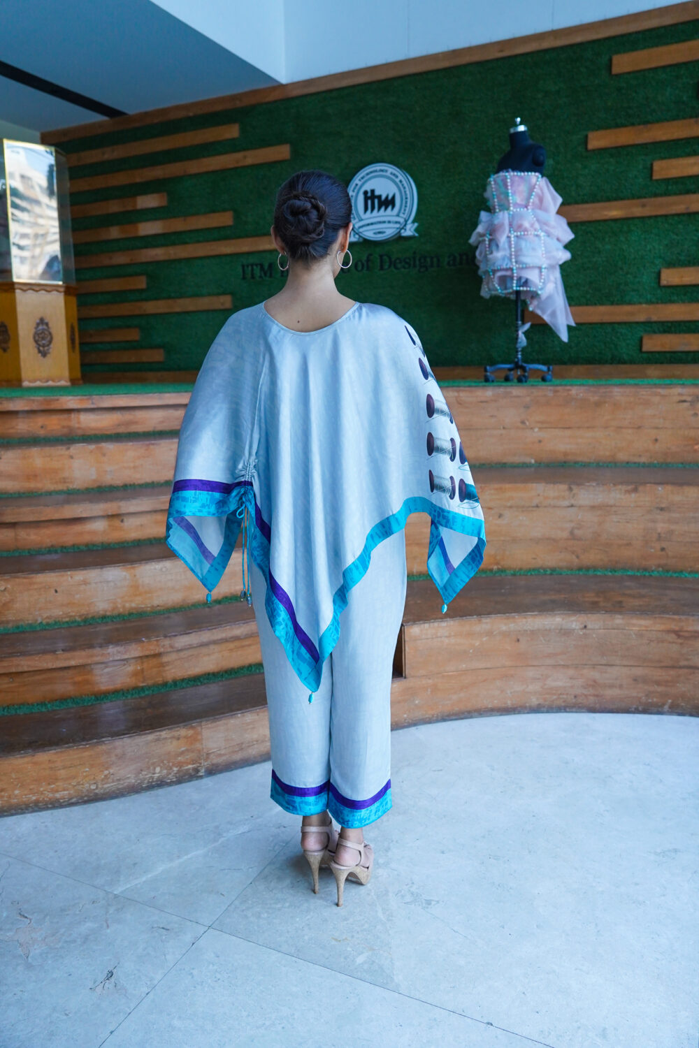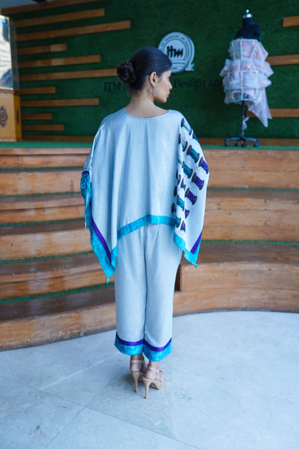 A Three pc set of a cape , inner and pants, this outfits sure to make you feel so comfortable yet so statement. The Cape can be turned around and worn in two ways and has rouching drawstrings on the edge to create drama. A no brainer, easy, elegant ensemble for any occasion.