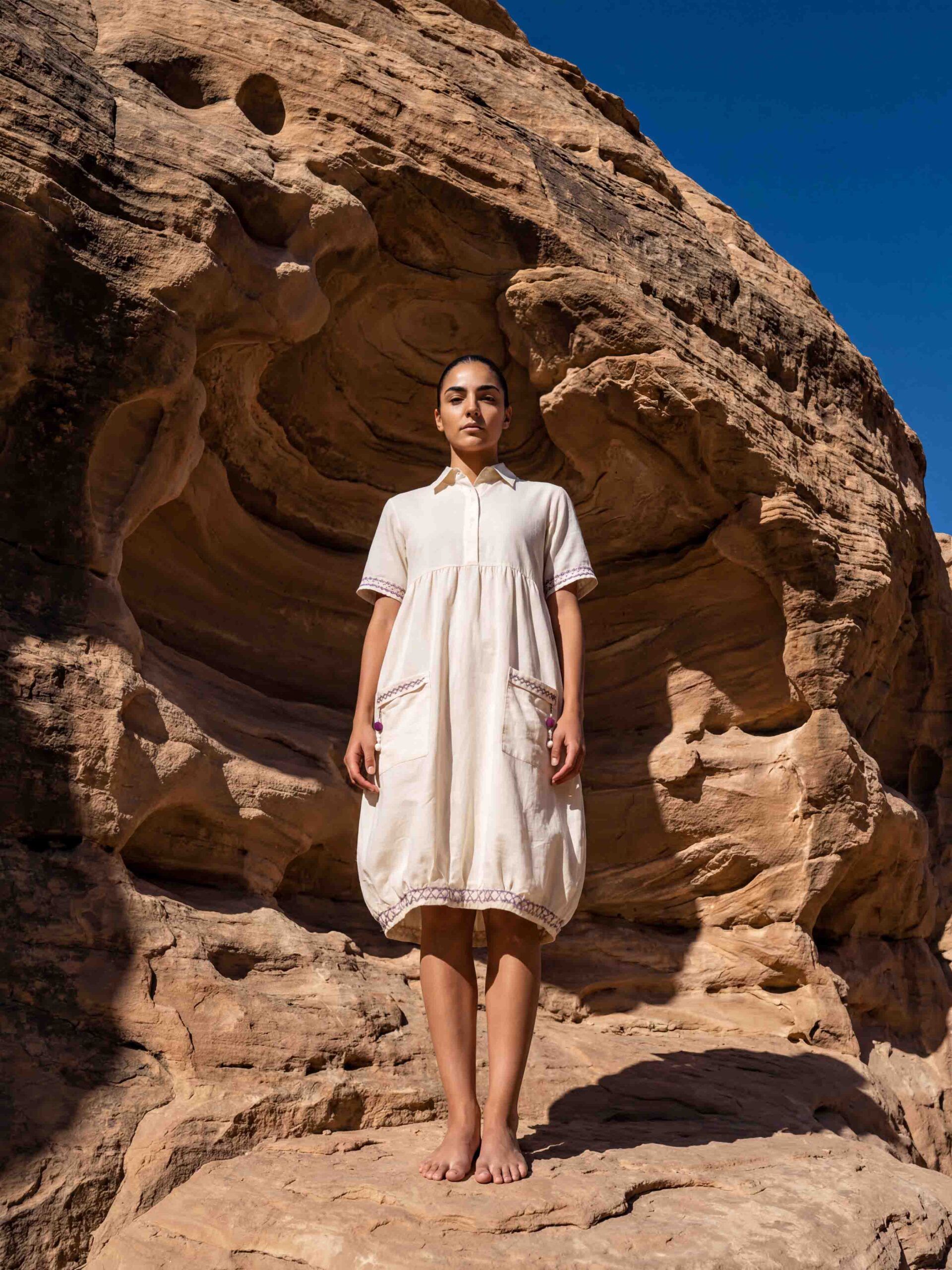 A knee-length mulmul balloon dress designed for effortless comfort and ease. Crafted from pure mulmul and lined with soft cotton cambric, it features delicate embroidery detailing along the edges and the signature Rudra Shiva tika placed at the back. The loose, airy silhouette offers a relaxed fit, making it an easy, comfortable choice for everyday summer wear.