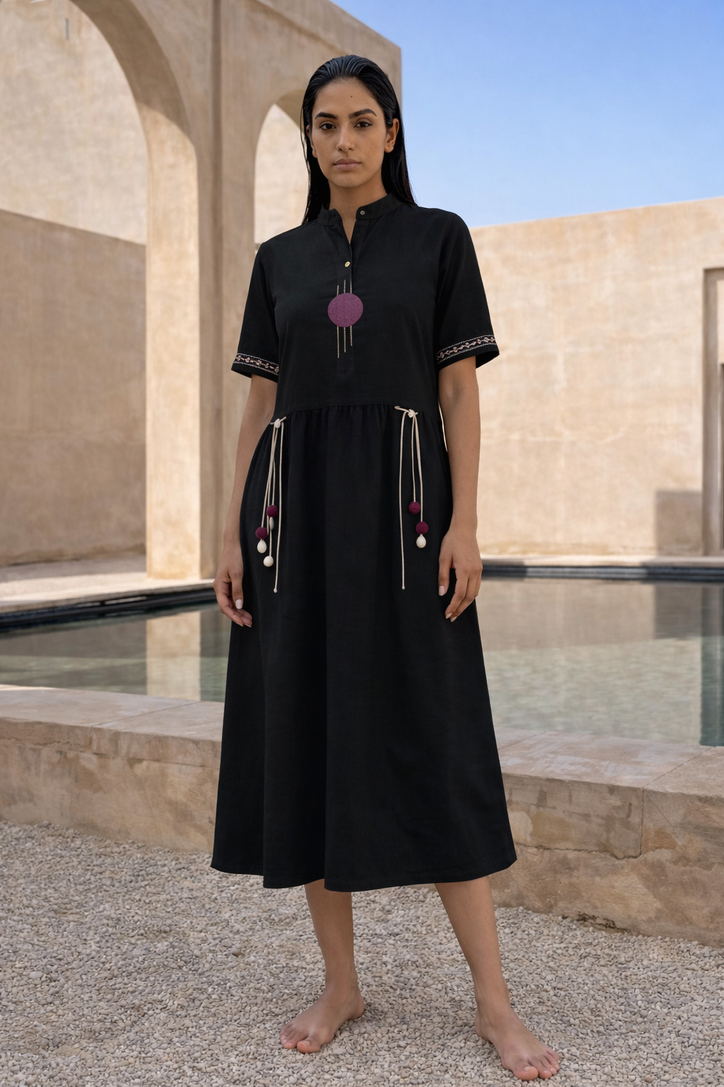 A maxi-length malmal empire dress crafted for comfort and ease. Featuring delicate tassel details along the empire cut, the signature Rudra Shiva tikka placed at the front, and subtle embroidery on the sleeves. Designed in a relaxed A-line silhouette and lined with soft cambric, it’s a breathable, effortless choice for afternoon brunches or summer evenings.