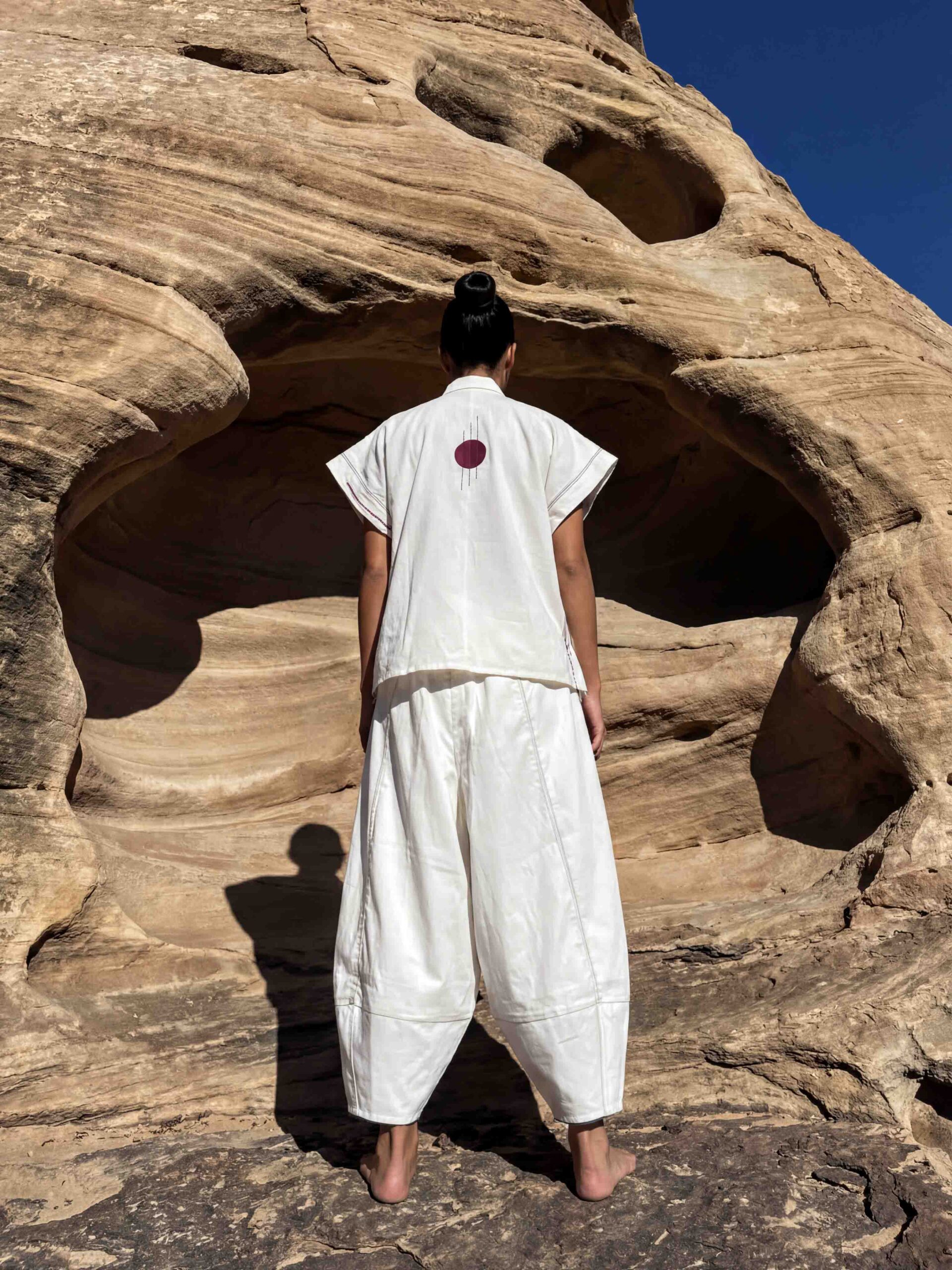 Paired with sculpted lantern pants, the look balances structure and ease. Fitted at the hip and gently broader at the base, the pants offer added volume and comfort without losing shape. Made from stretch cotton, they’re designed for all-day wear. A coordinated belt threads through the pant loops, with playful tassels that bring movement, fun, and a touch of drama to the ensemble. The Rudra Shiva tika is also visible on the pants, tying the look together seamlessly.