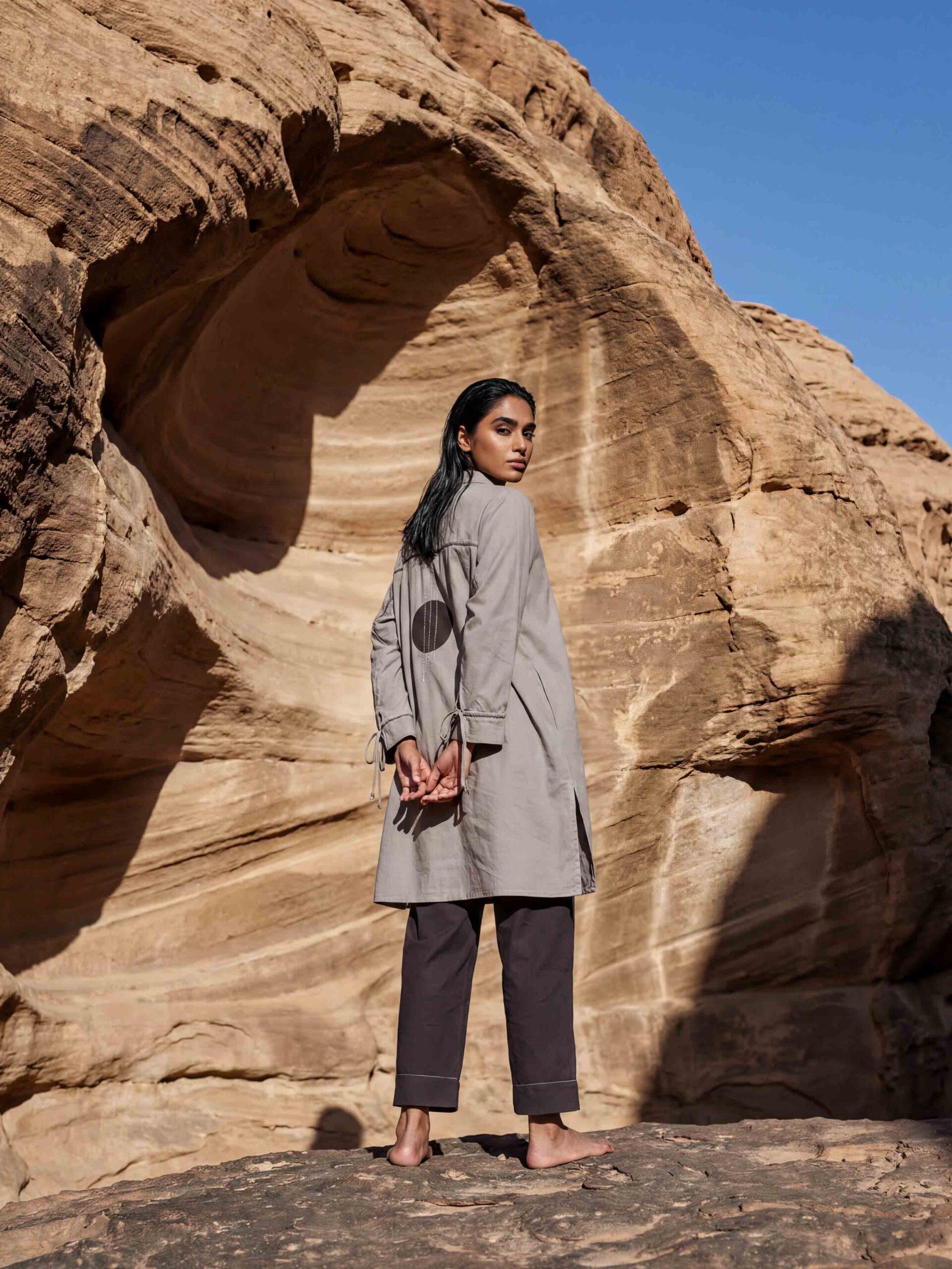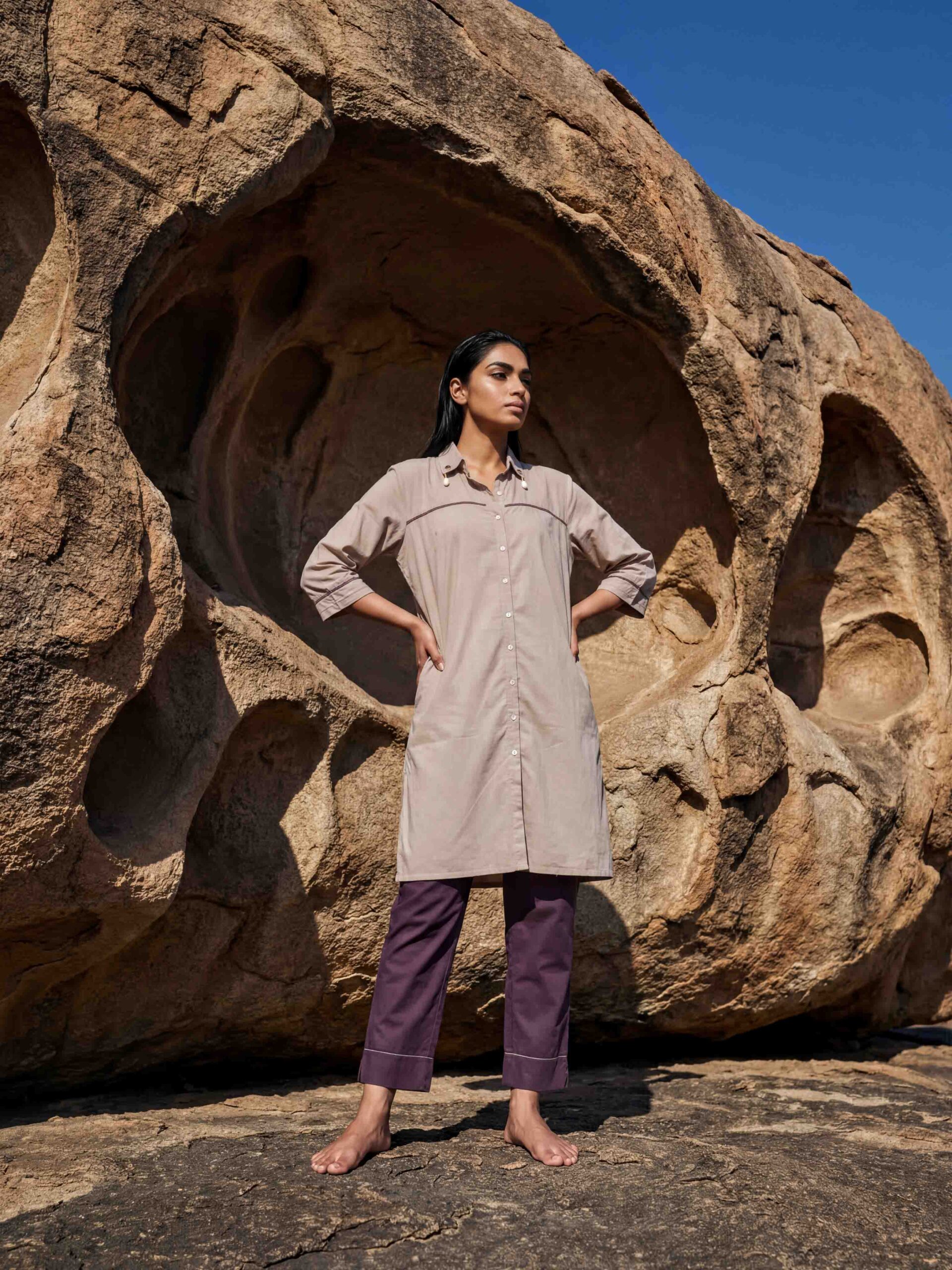 A classic high-fusion cream co-ord designed to stand out. The box-fit, oversized tunic is crafted in malmal and lined with soft cambric, featuring the signature Rudra Shiva Tikka as a bold focal point at the back. Subtle shell details along the collar add texture and character. Paired with straight-fit pants made from stretch cotton, finished with delicate embroidery at the hem, this set offers all-day comfort with effortless style. A timeless wardrobe essential that blends comfort, elegance, and Rudra’s signature statement.