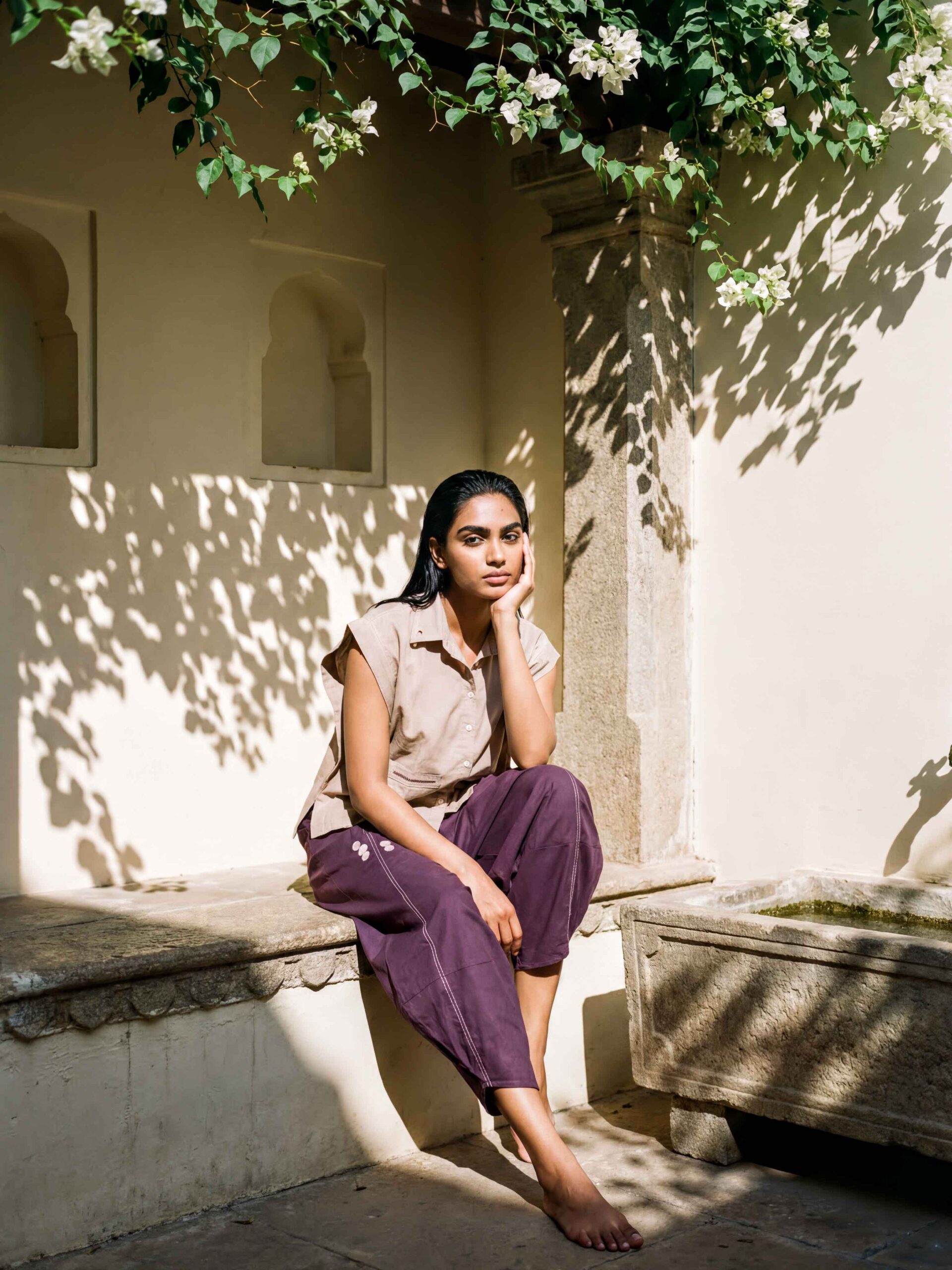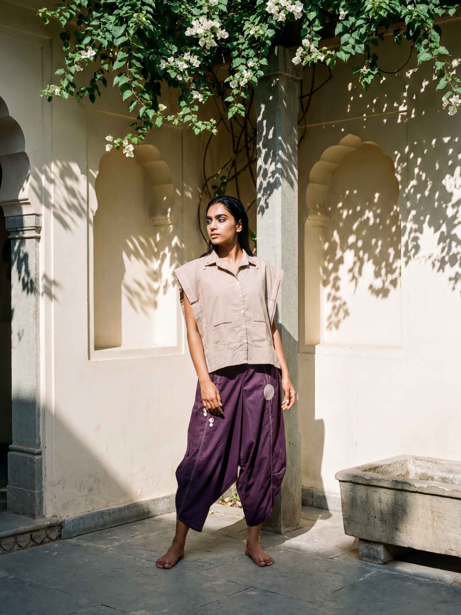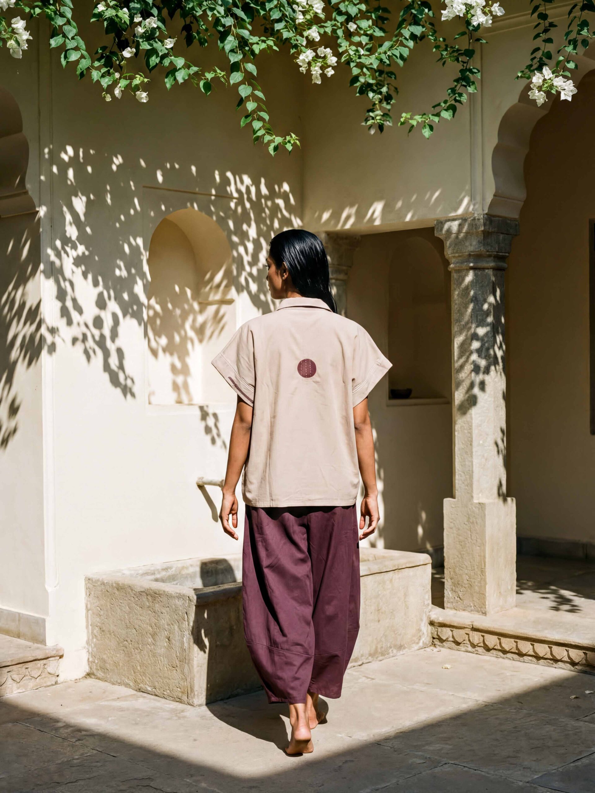 Paired with sculpted lantern pants, the look balances structure and ease. Fitted at the hip and gently broader at the base, the pants offer added volume and comfort without losing shape. Made from stretch cotton, they’re designed for all-day wear. A coordinated belt threads through the pant loops, with playful tassels that bring movement, fun, and a touch of drama to the ensemble. The Rudra Shiva tika is also visible on the pants, tying the look together seamlessly.