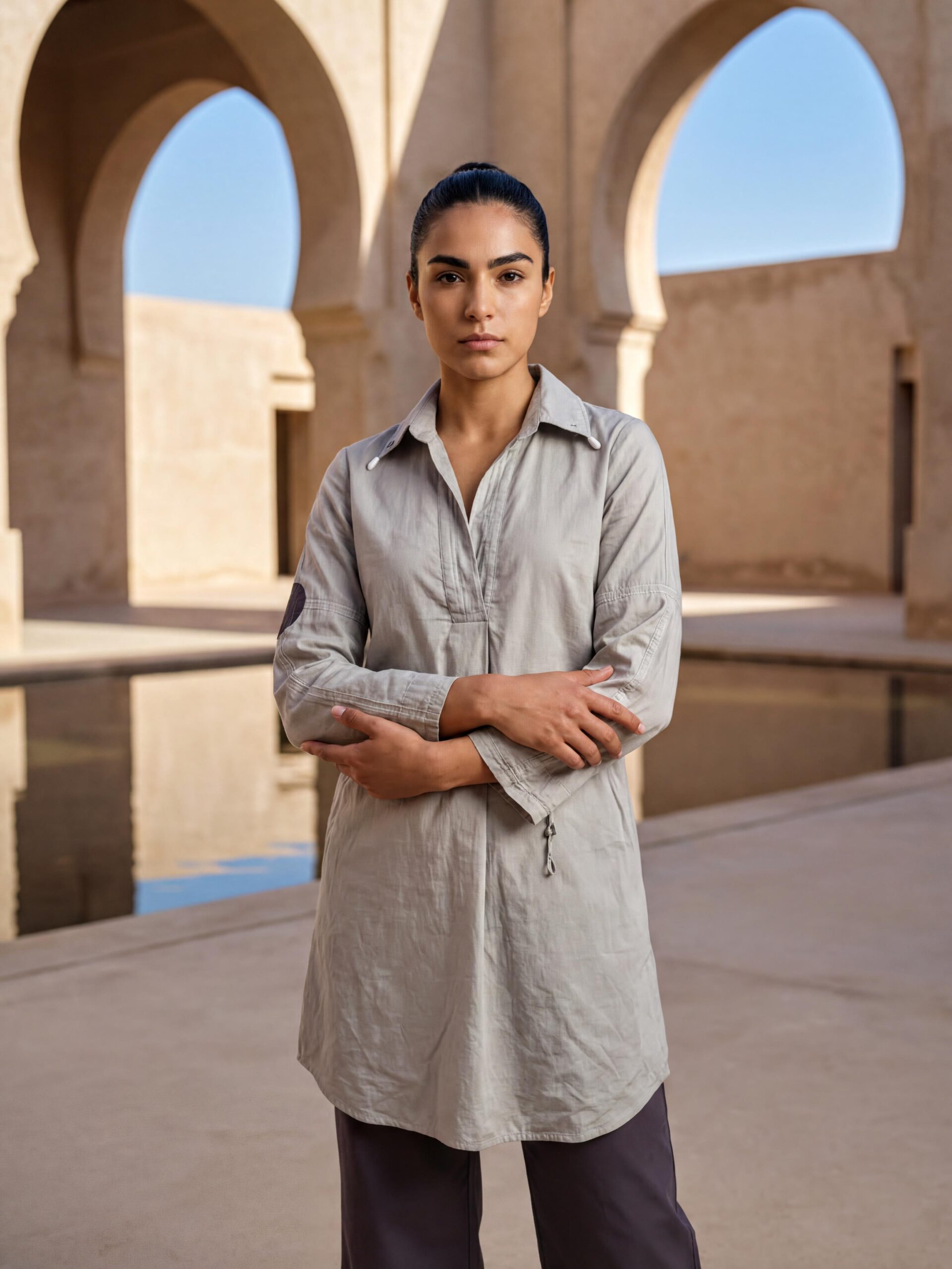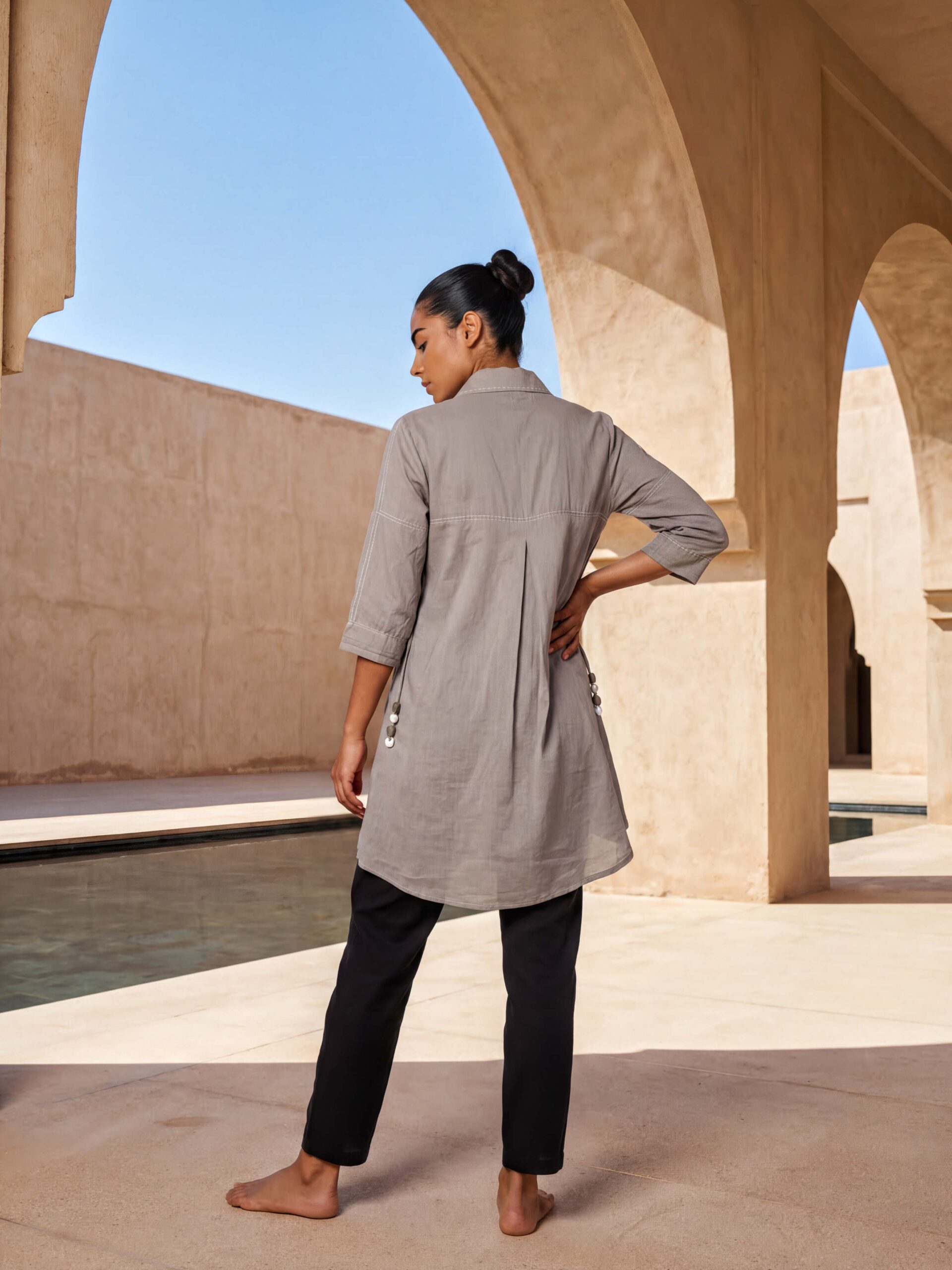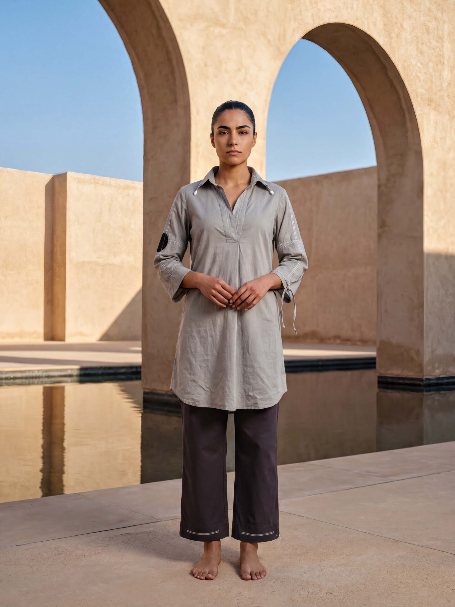 A timeless straight-fit kurta crafted in breathable mul and lined with soft cotton cambric for effortless summer comfort. Designed with subtle pleats to add gentle volume at the hips, this classic silhouette is elevated with the signature Rudra Shiva Tika embroidered asymmetrically on one sleeve. Paired with straight pants made from stretch cotton, the set offers ease, movement, and everyday elegance. A no-brainer summer essential with refined Rudra detailing.