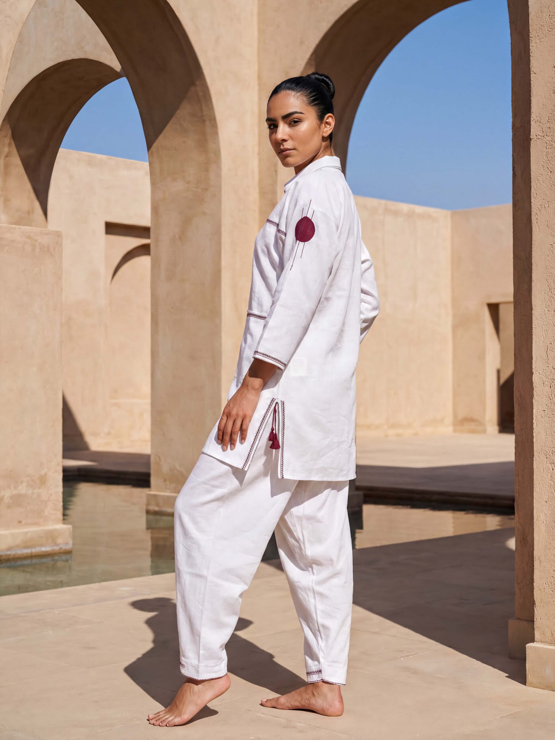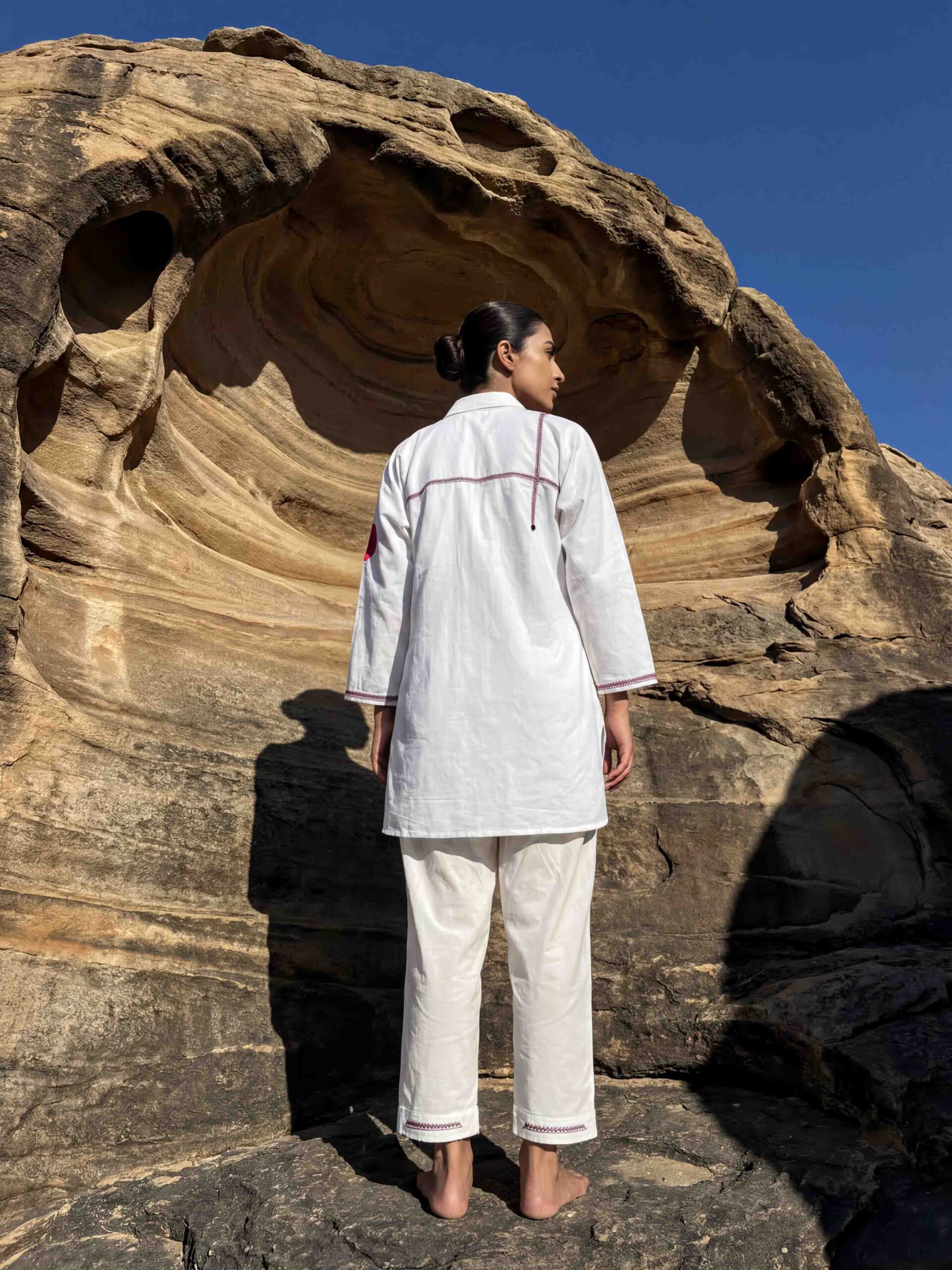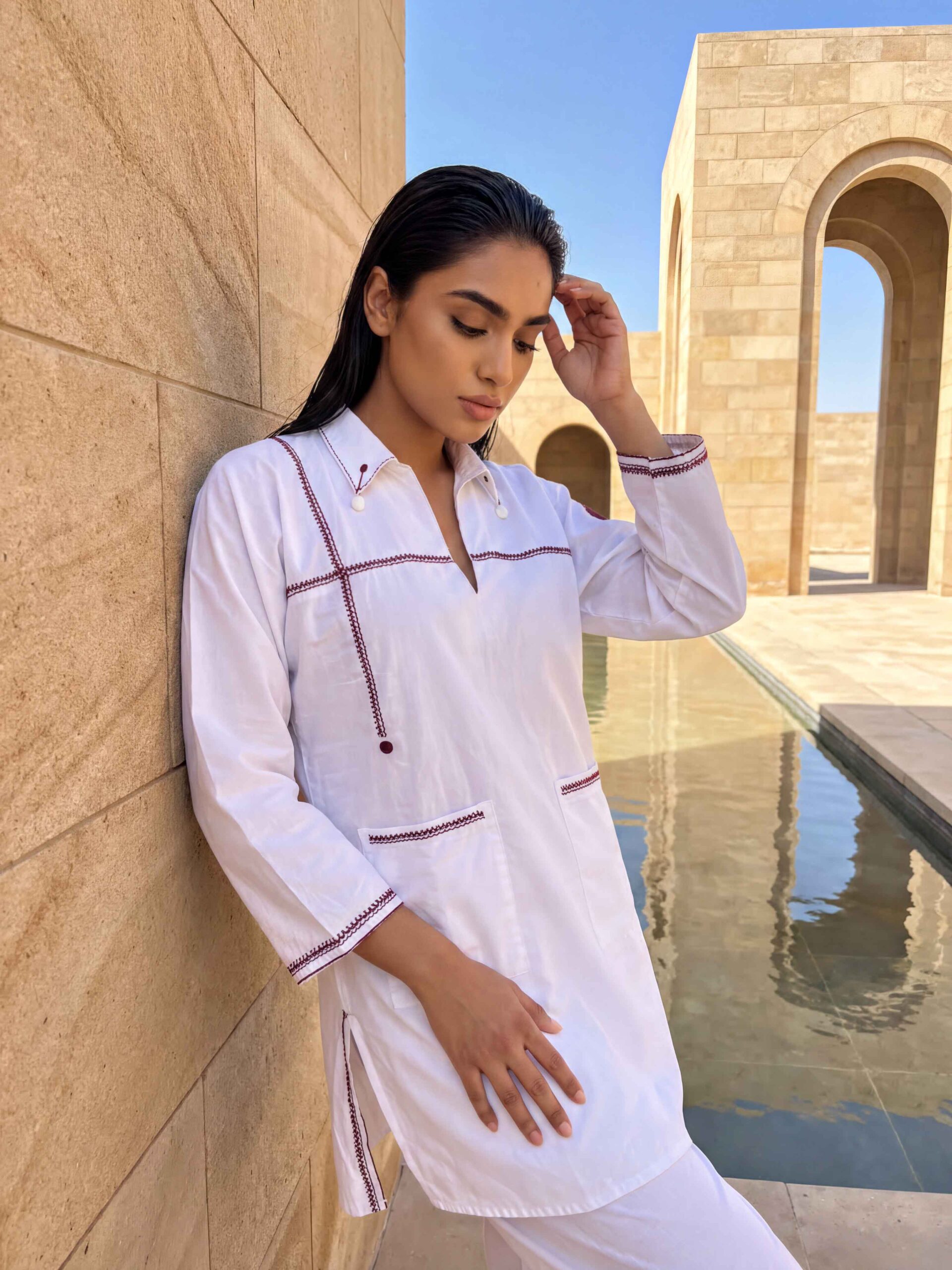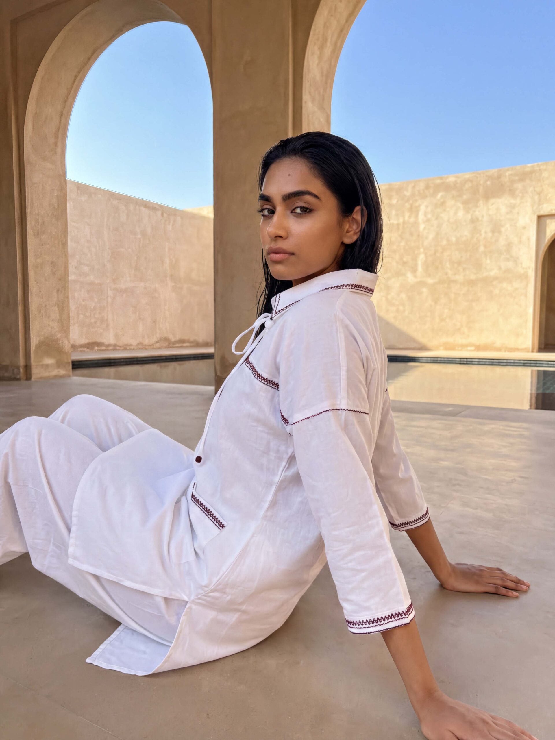 A fresh, easy-fit summer set designed for comfort and character. The short tunic features asymmetric embroidery along the yoke and two playful front pockets that add both style and practicality. Crafted in malmal and cambric, it feels light and breathable for warm days. Paired with ruched, pleated pants made from stretch cotton, finished with subtle hem embroidery, this set offers all-day comfort with effortless fusion appeal. A classic, functional summer essential.