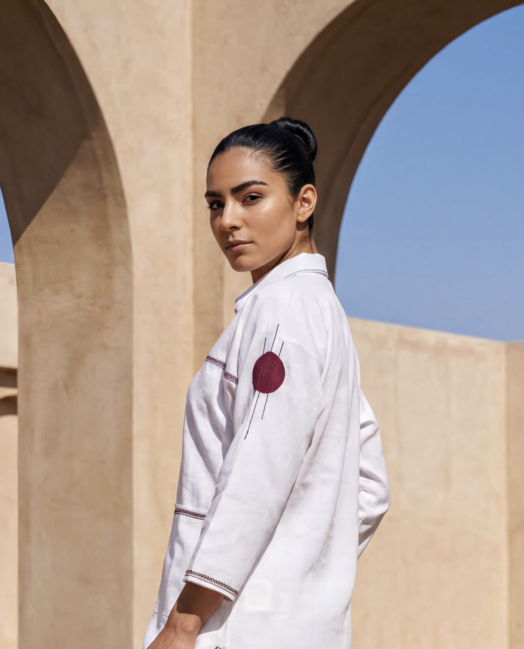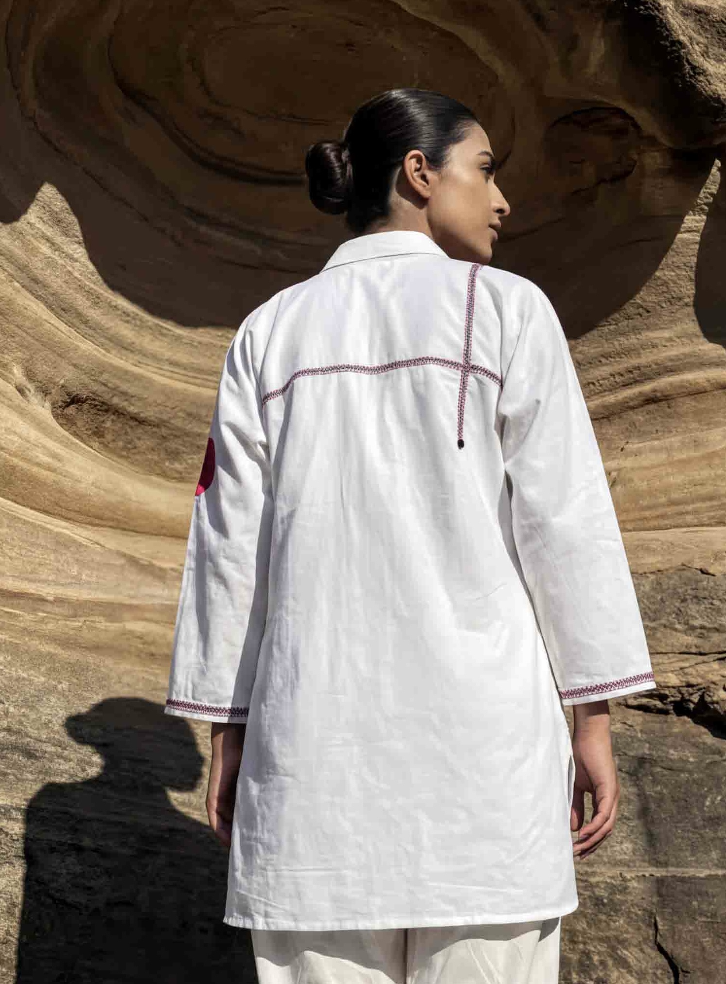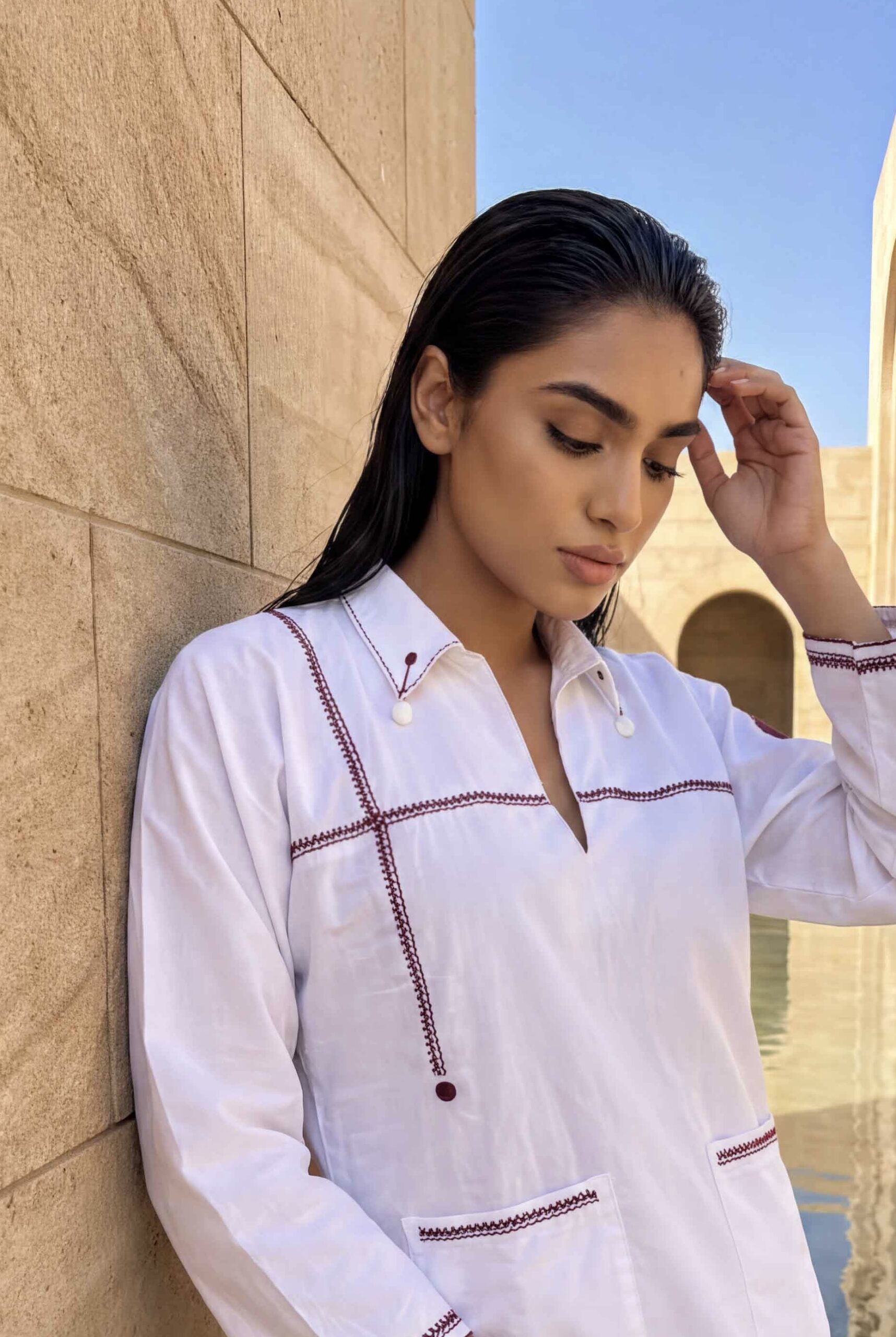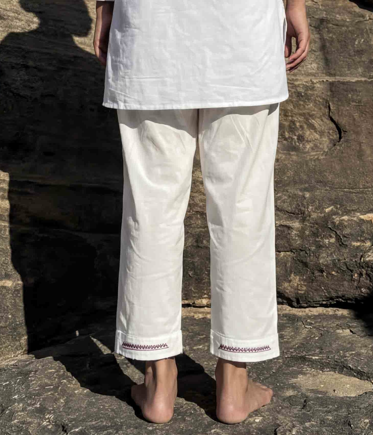 A fresh, easy-fit summer set designed for comfort and character. The short tunic features asymmetric embroidery along the yoke and two playful front pockets that add both style and practicality. Crafted in malmal and cambric, it feels light and breathable for warm days. Paired with ruched, pleated pants made from stretch cotton, finished with subtle hem embroidery, this set offers all-day comfort with effortless fusion appeal. A classic, functional summer essential.