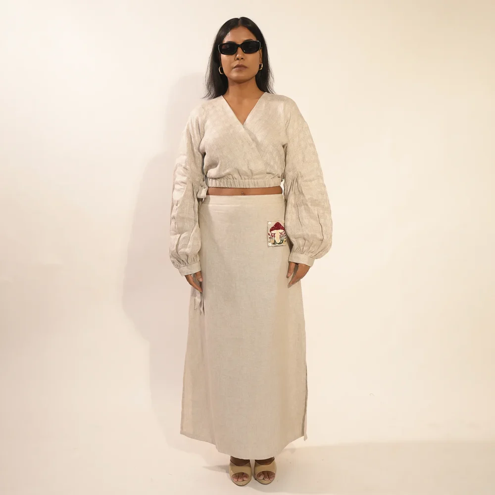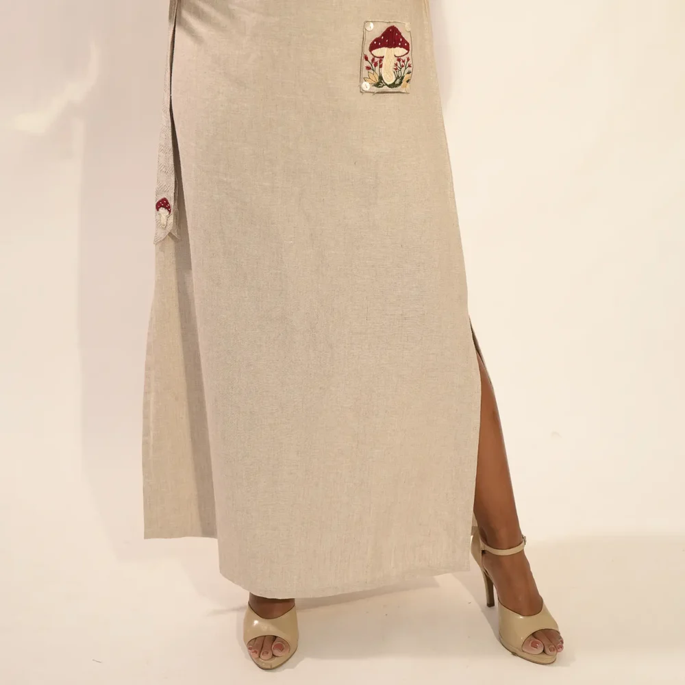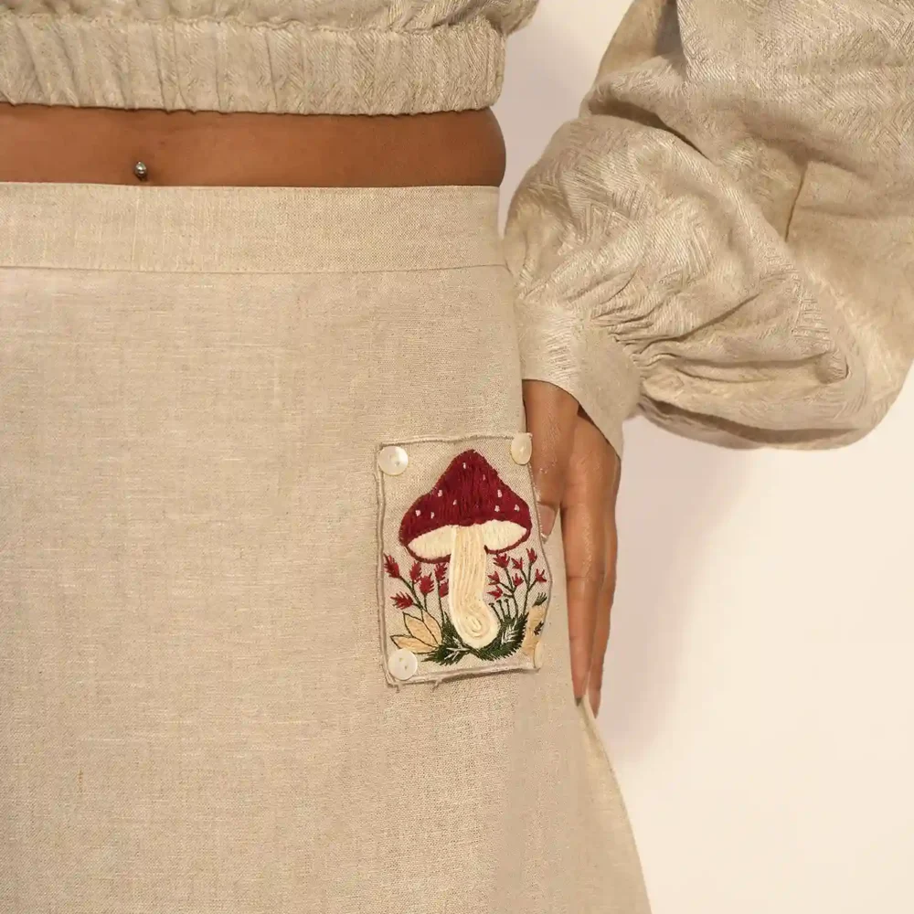 The coordinating skirt is a straight-fit silhouette with subtle side slits for ease and elegance. A thoughtfully placed front pocket is adorned with delicate mushroom embroidery, adding charm and personality. The back of the skirt is elasticated to provide a comfortable and flexible fit. This set is designed to turn heads and spark conversations wherever you go.