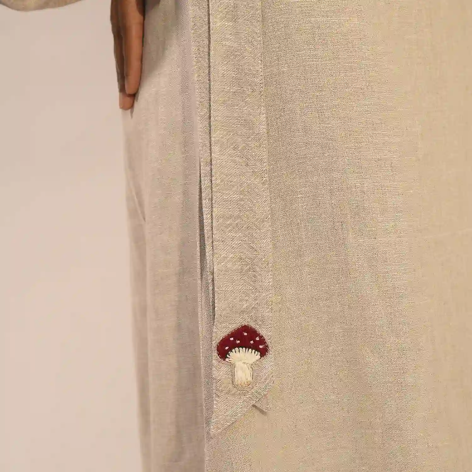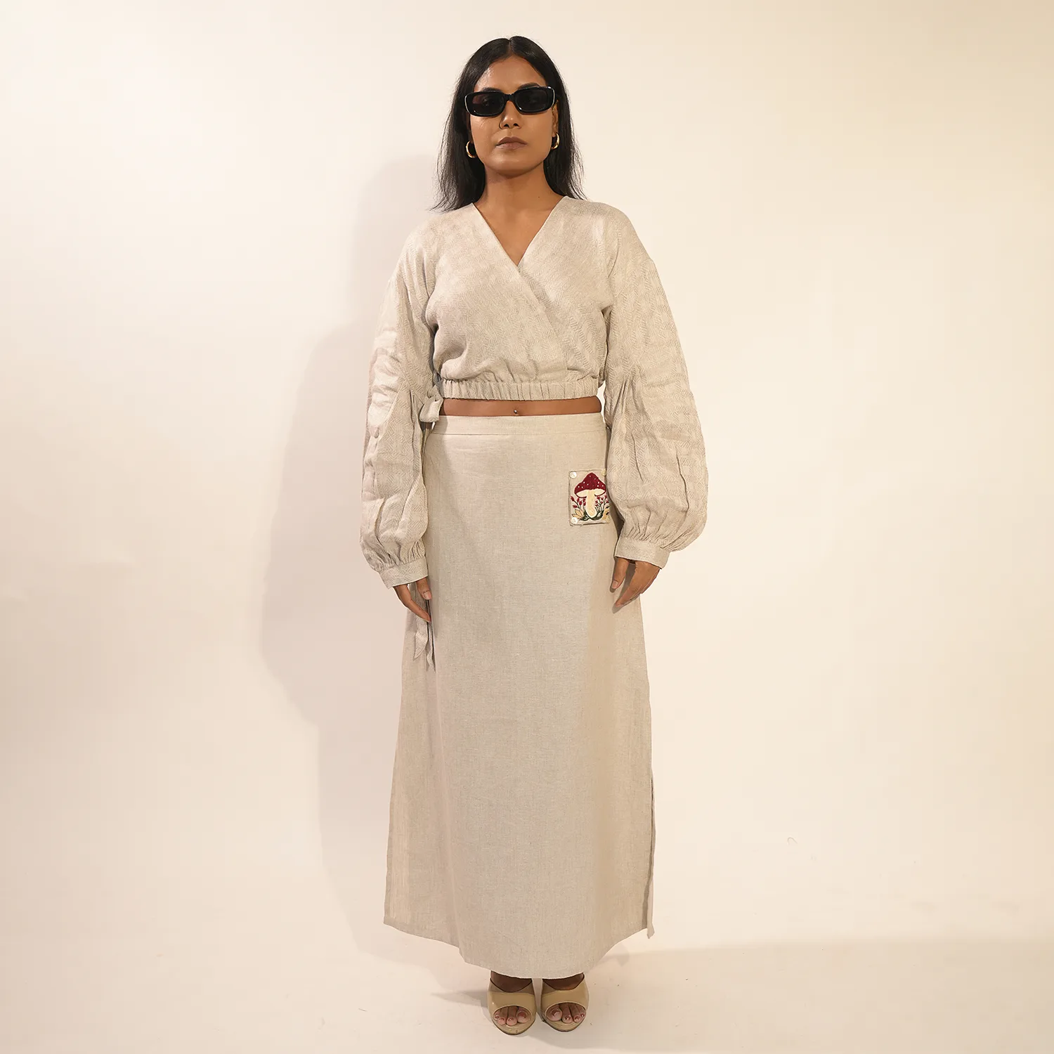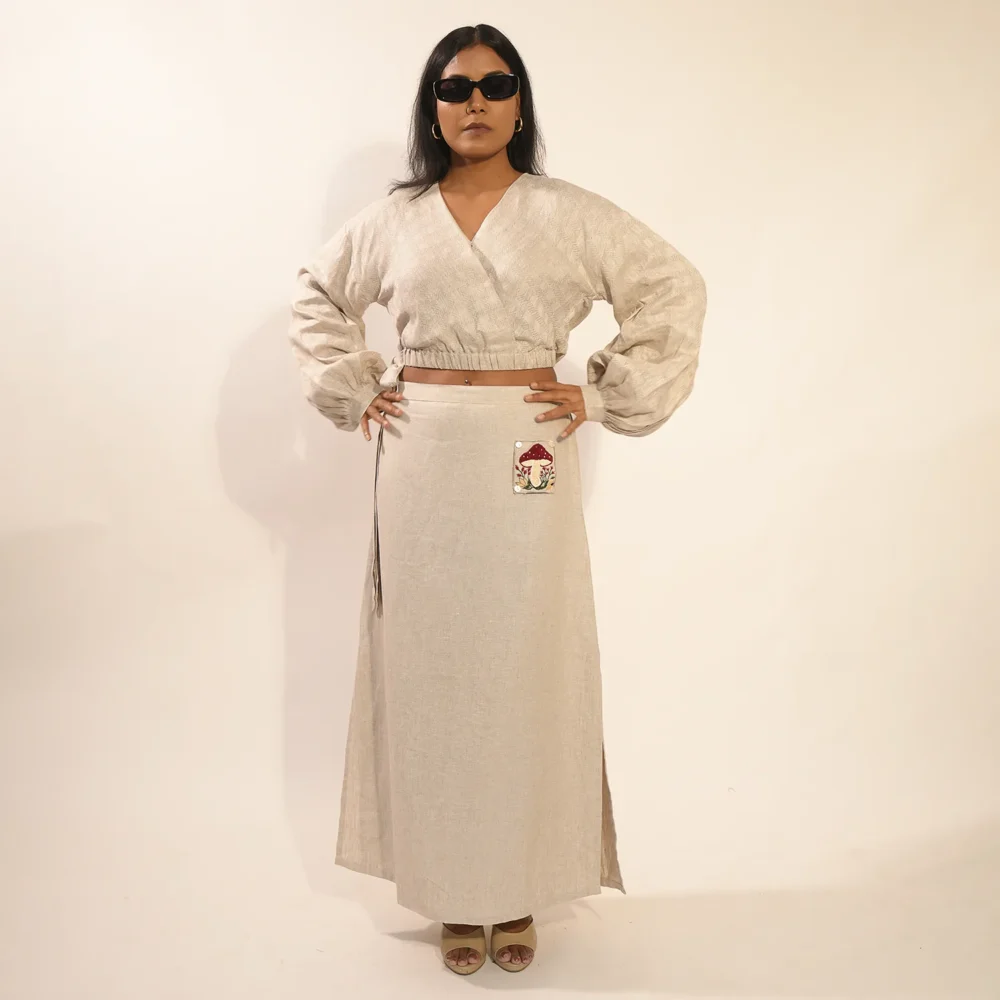 The coordinating skirt is a straight-fit silhouette with subtle side slits for ease and elegance. A thoughtfully placed front pocket is adorned with delicate mushroom embroidery, adding charm and personality. The back of the skirt is elasticated to provide a comfortable and flexible fit. This set is designed to turn heads and spark conversations wherever you go.