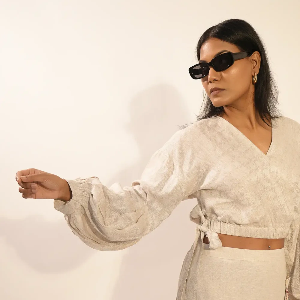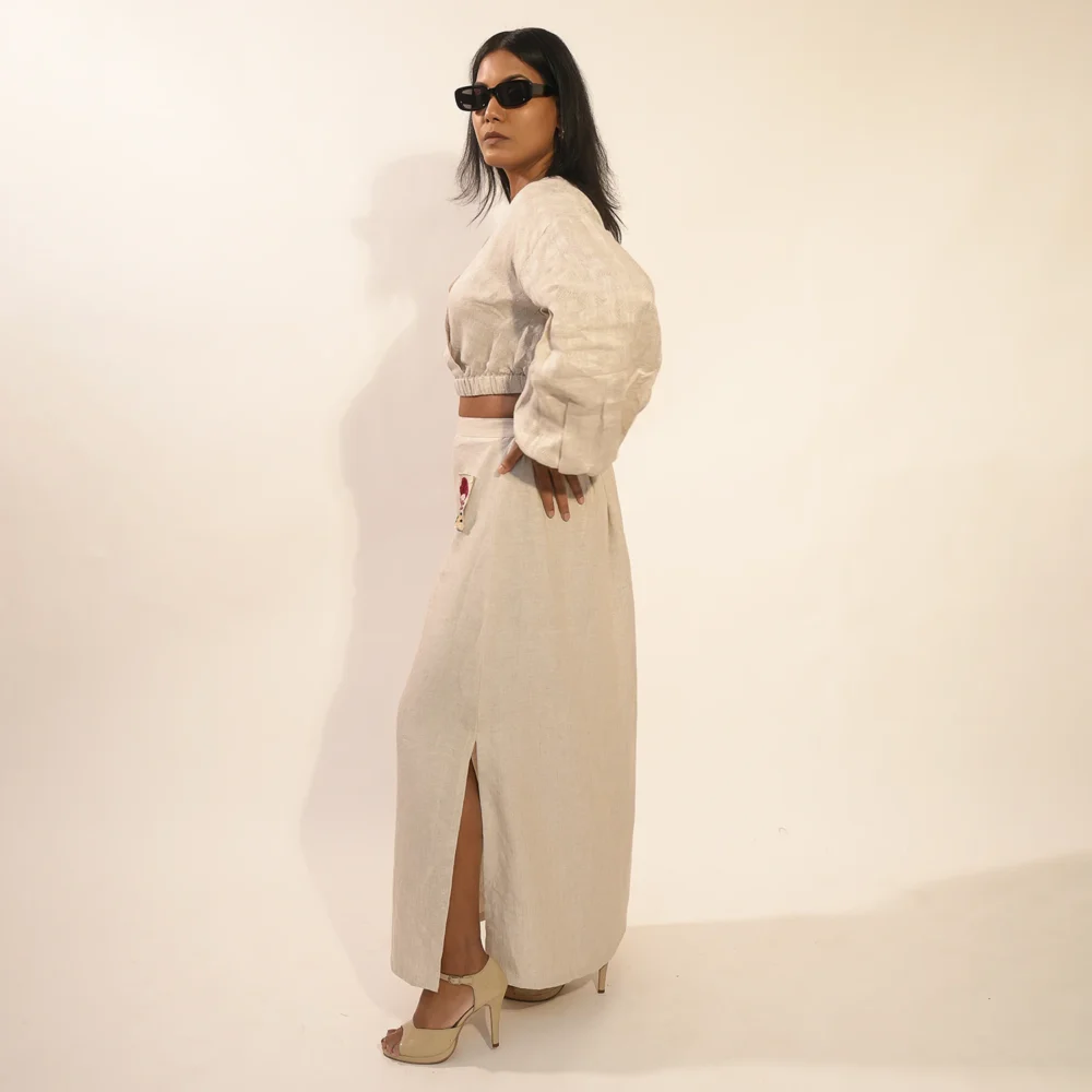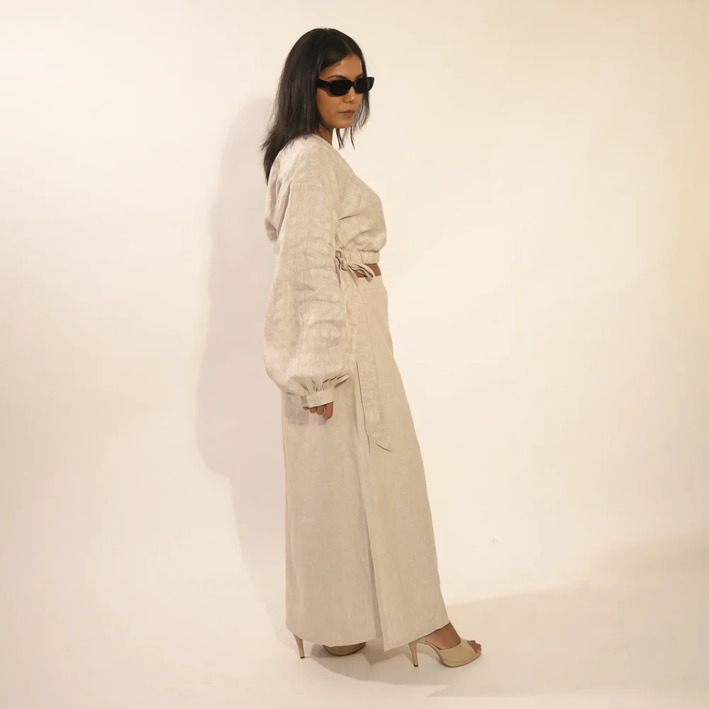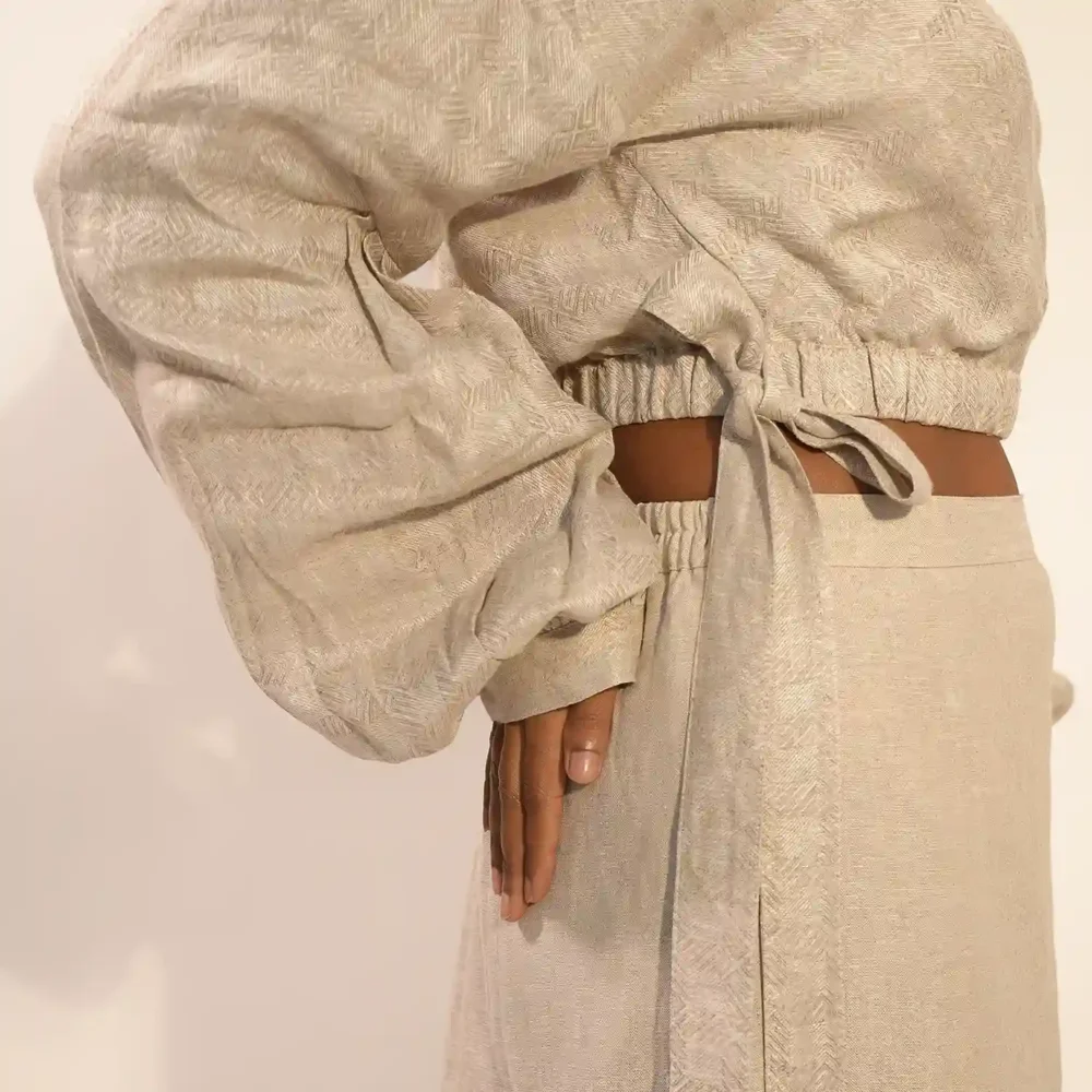 Crafted from pure linen, this set blends comfort with effortless style. The crop top features a flattering cross-front design and an elasticated hemline that ensures it stays perfectly in place. Its statement sleeves, detailed with multiple pleats and a voluminous base held together with a structured cuff, bring a bold, dramatic touch to the look. Side tie-ups on the top add another layer of interest and movement.