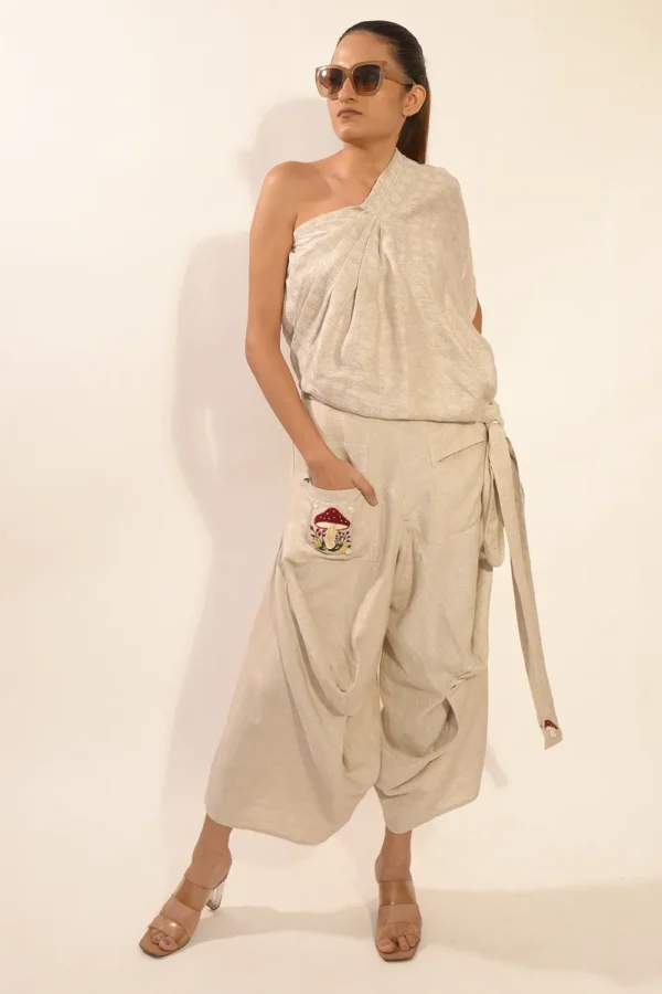 This elegant jacket is designed for comfort, movement, and modern sophistication. The base layer is a full-sleeve inner made from a soft cotton-linen blend with a hint of stretch, offering a snug yet breathable fit. Layered over it is a cropped flap jacket, thoughtfully designed without traditional side seams. Instead, it connects with slender side bands and a belt that cinches the waist, creating a defined and flattering silhouette.
