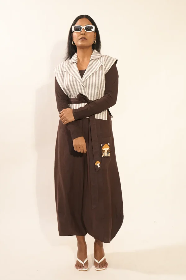 This striking two-piece set blends contemporary style with comfort and ease. The one-shoulder top is designed with pleats along the bodice, creating soft volume and structure that flatter the form. A gentle cowl drop at the hem adds fluidity, while the side tie-up ensures a custom fit and all-day comfort.