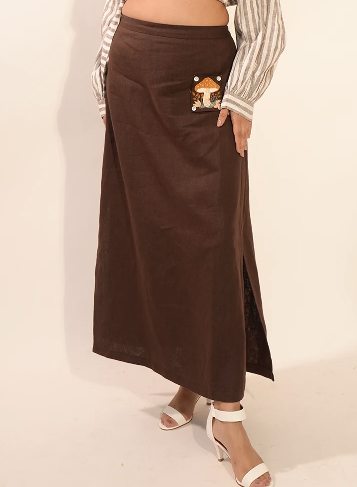 The skirt is a straight-fit silhouette with subtle side slits for ease and elegance. A thoughtfully placed front pocket is adorned with delicate mushroom embroidery, adding charm and personality. The back of the skirt is elasticated to provide a comfortable and flexible fit. This skirt is designed to turn heads and spark conversations wherever you go.