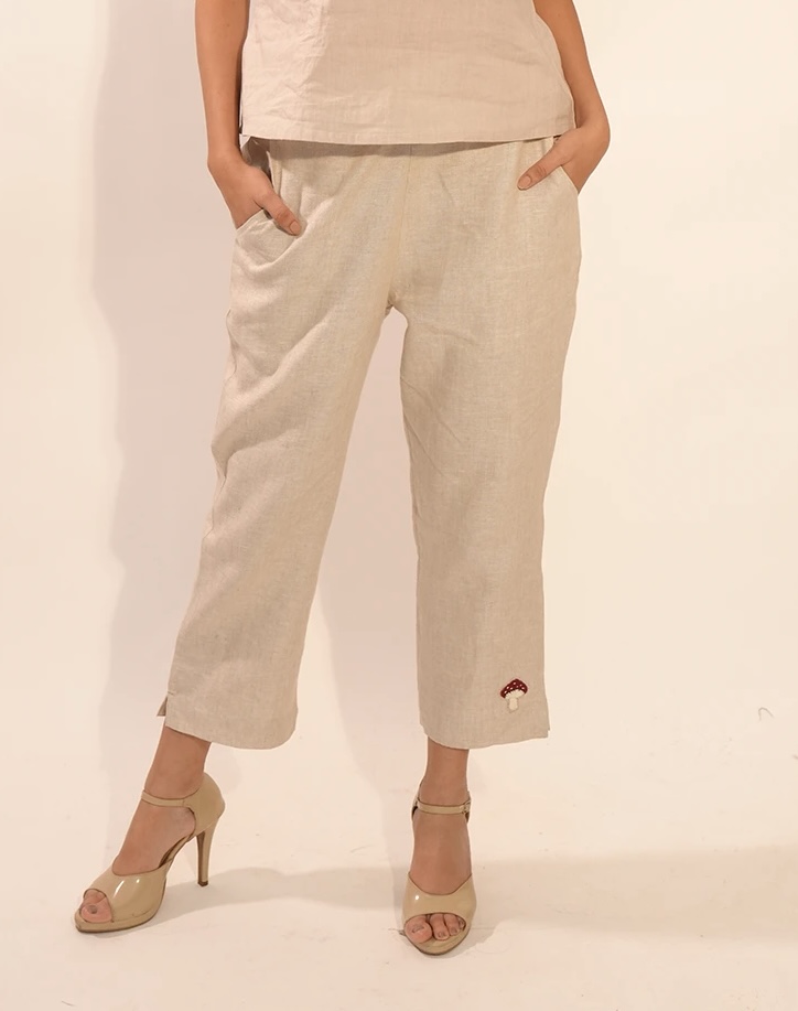 The pants are cut in a clean, straight silhouette and feature a delicate mushroom embroidery detail near the hem, adding a subtle touch of character.