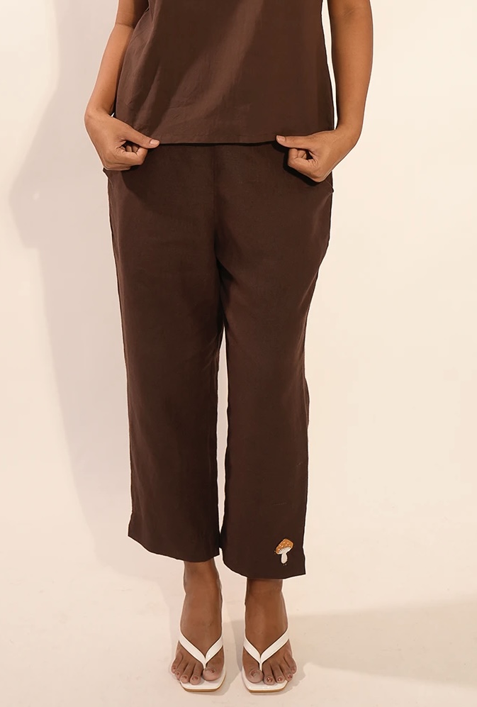 The pants are cut in a clean, straight silhouette and feature a delicate mushroom embroidery detail near the hem, adding a subtle touch of character.