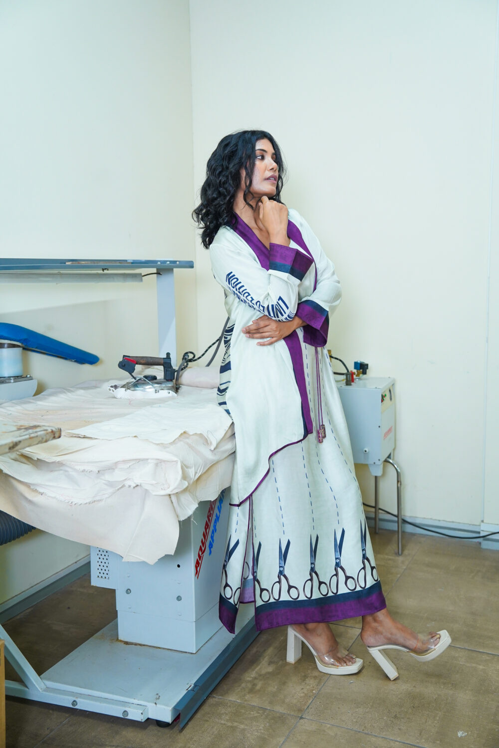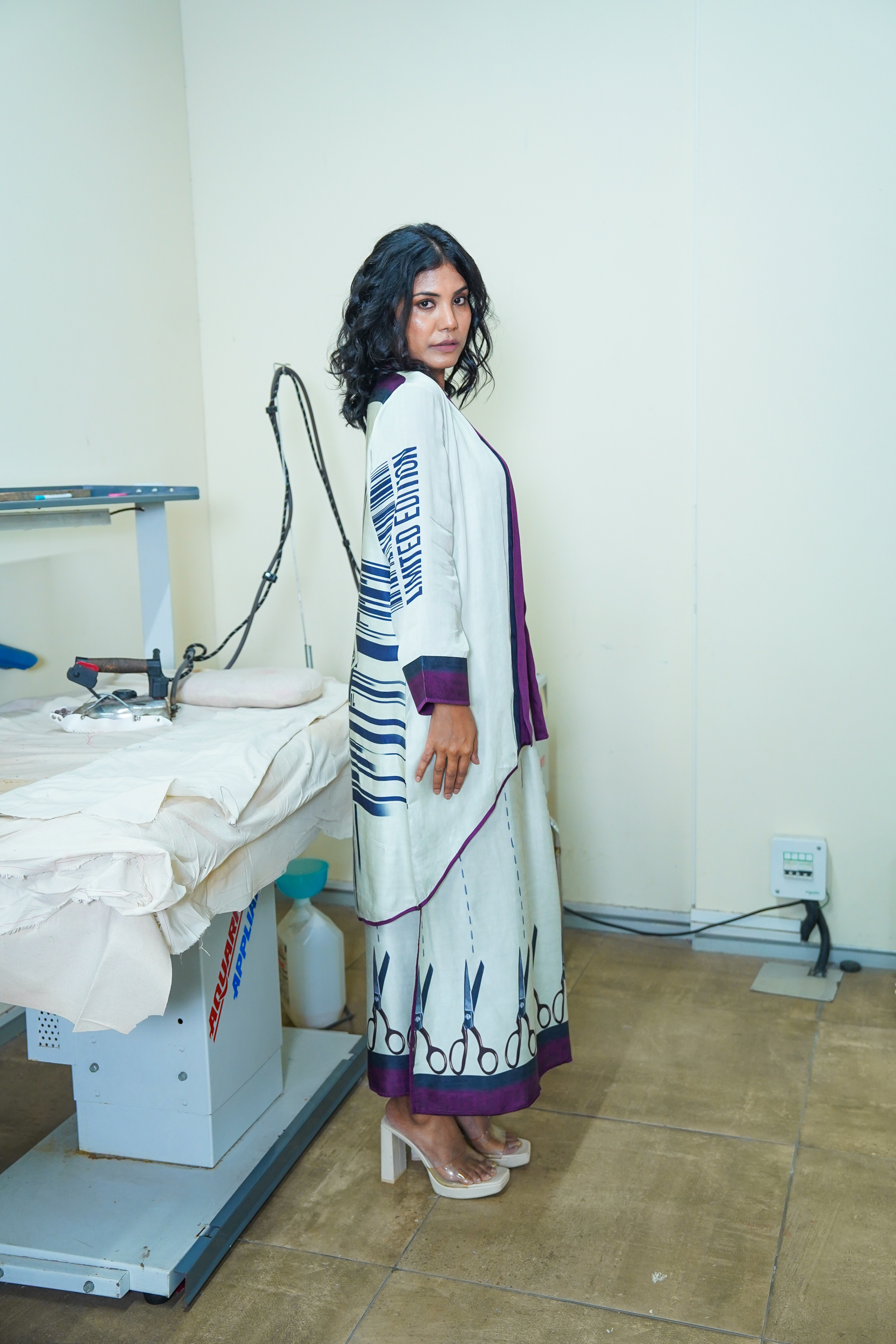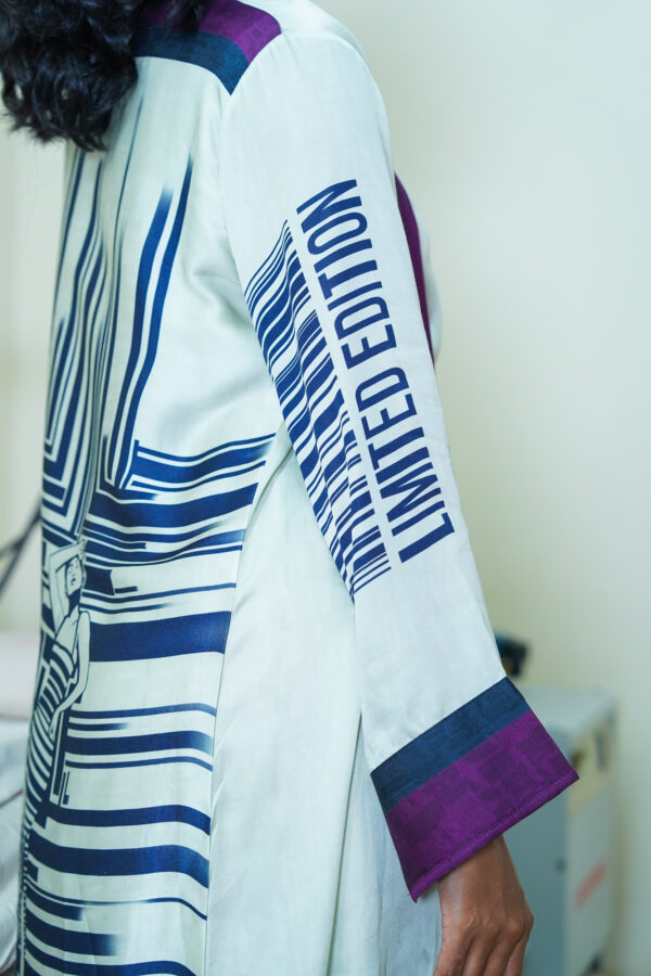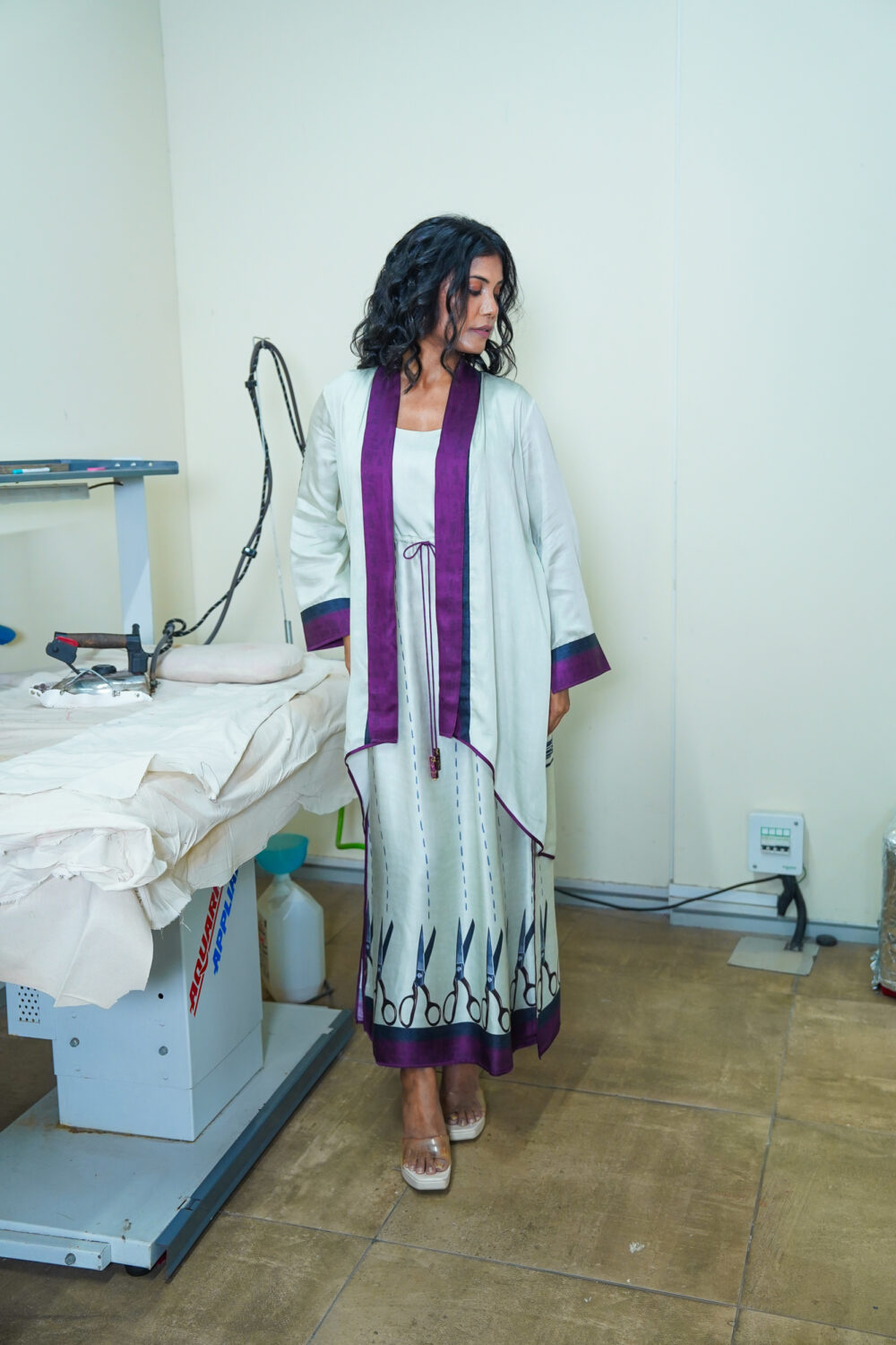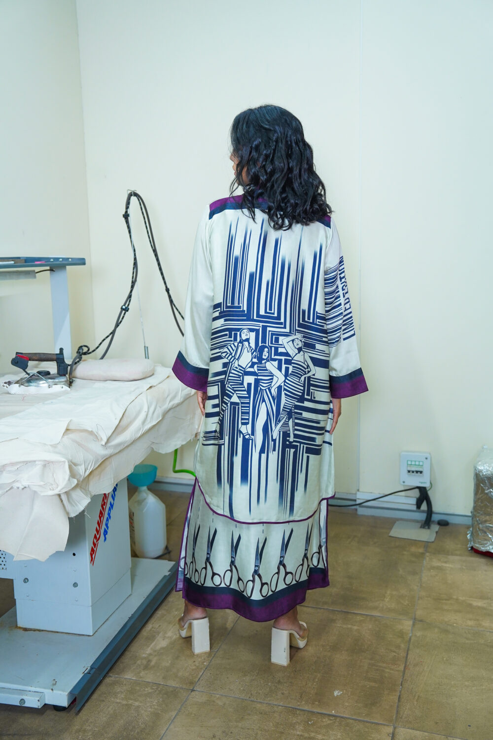 An empire tie dress with a drawstring to adjust the fit topped with a soft flow roll collar jacket makes this ensemble perfect little winner. The Prints are statement and reflect the collection theme. The fabric used is cotton satin .. easy … comfortable and super soft on the body.